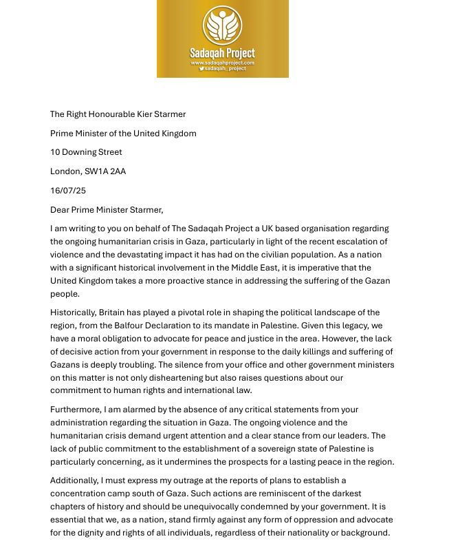 In response to the ongoing conflict in Gaza and the absence of political pressure on Israel from the UK government, The Sadaqah Project has sent a letter to the Prime Minister's office. They are urging the UK to fulfill its historical obligation to pressure the Israeli government to put an end to its assault on the people of Gaza.